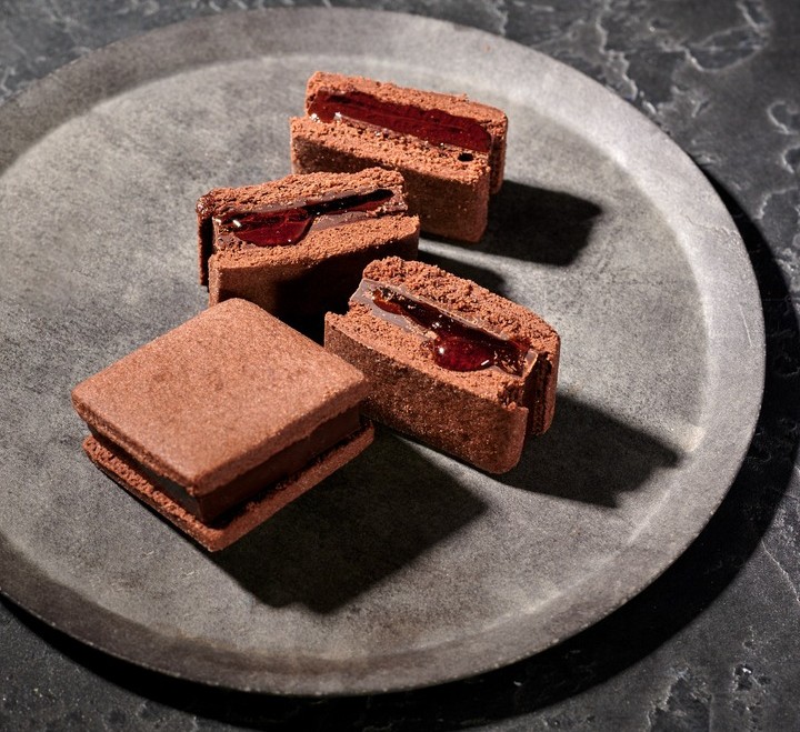 パティスリー キハチの新作チョコレート菓子。ココアサブレのサクサク食感と、しっとりとしたビターチョコレートからとろりと溶け出すキャラメルソースが絶妙な組み合わせ。(5個入)