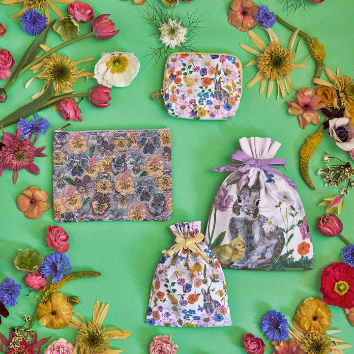 フラットポーチ ¥2,200、ティッシュケースポーチ ¥2,200、巾着(M/S)¥1,650/¥1,100
