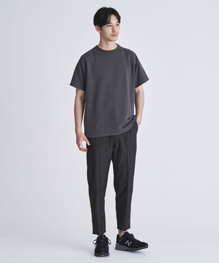 ピンタックでセンタークリースを入れて、スラックスパンツの様にきれいめな雰囲気に。クリースラインは縫い付けを行っている為、履いていくうちに消える事もなくイージーケアな仕様です。