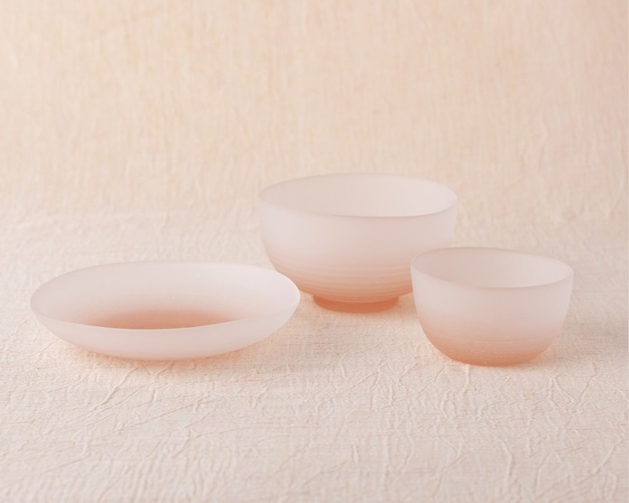 桜が吹雪くさまを表現した吹雪シリーズ。手びねりのようなやわらかいシルエットとフロスト加工による曇り硝子が和の食卓にぬくもりを運びます。春のお茶時間にぴったりな淡い色合いと絶妙なフォルムの器たちは春のお菓子にそっと馴染み、あたたかな時間を運んでくれます。