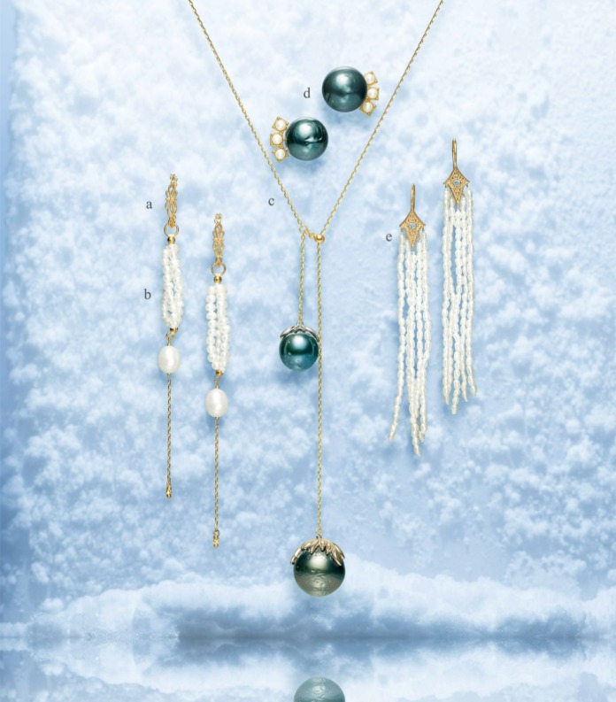 暗くなりがちな冬のコーディネートや顔周りを冬の森に降り積もる雪のようなパールの輝きでリュクスに演出。サイズ違いが生み出すコントラストや動くたびキラキラと華やぐ揺れ感など様々な表情が楽しめます。パールのやわらかな印象を引き締めてくれるゴールドの輝きもアクセント。