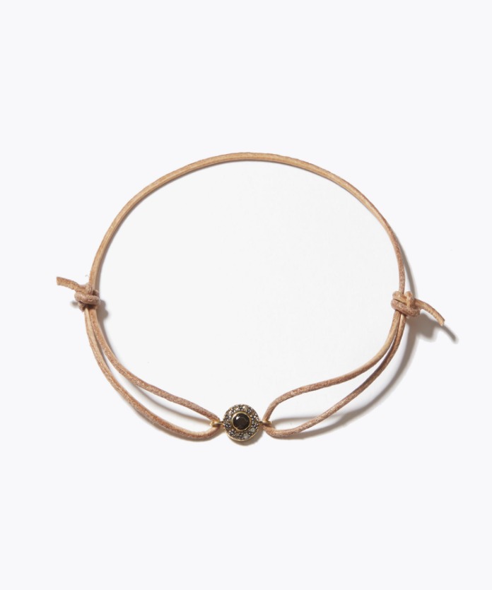 神秘的な“evil eye”モチーフの黒目の部分に、パヴェダイヤモンドで取り巻いたパイライトを一粒配したヌメ革ブレスレット。